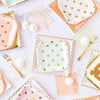 Planning a sophisticated bridal shower? These 5" blush napkins are a pretty accessory for your finger foods and desserts. The square shape of these napkins make them ideal to use when serving cake at a princess tea party or ballerina birthday. Pair these napkins with our Blush Scalloped Plates and Cream Polka Dot Plates to create a stunning and simple place setting. • 5" x 5" Folded Size • 18 Napkins per Pack • Gold Foil Accents