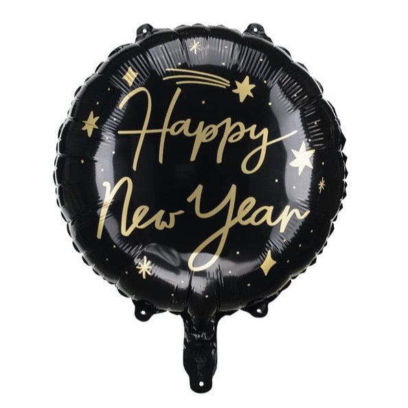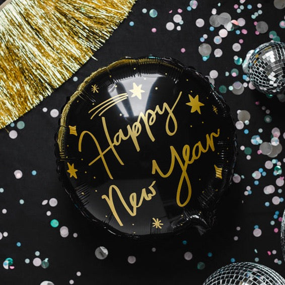 One foil balloon Happy New Year in black color with print in gold, size before inflation approx. (18''), size after inflation approx. (14'').