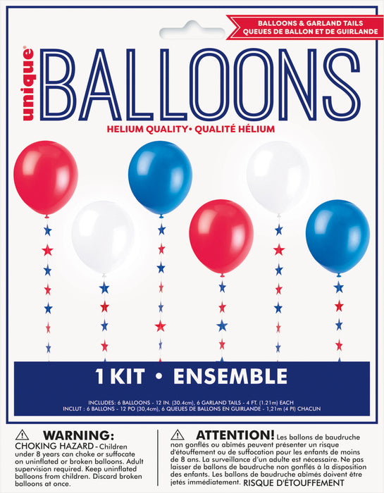 This kit balloon comes with 6 balloons (3 different colors) and tails. Balloon size is around 12 in and the tassel is around 4 ft and tassels come decorated in blue and red stars.