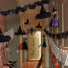 - 3 Flying witches with black tissue paper honeycomb hats and striped honeycomb skirts in black and orange, black and mint, and black and lilac