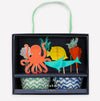 - Shiny blue and silver holographic foil details on the shark and octopus toppers