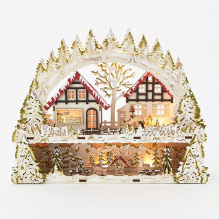 Add a touch of alpine magic to your holiday decor this season. A beautiful small town holiday wintry scene. with 13 LED lights.