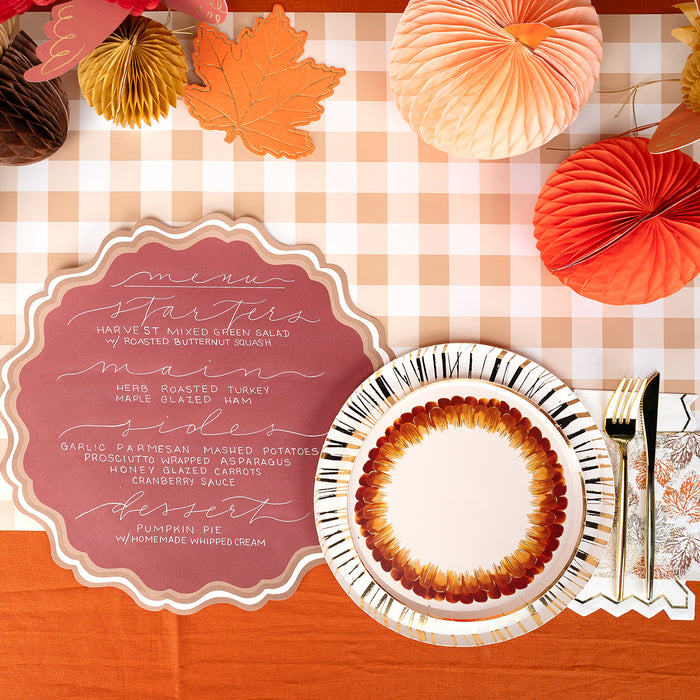 Enhance your fall dining experience with our Harvest Fancy Scallop Placemat. Perfect for Thanksgiving or any autumn gathering, these placemats add a touch of elegance with their scalloped edges and vibrant harvest design. They can also be used as a menu to let guests know what they will be enjoying. Make your table setting stand out and impress your guests with this beautiful addition