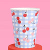 24 paper cups Holds 12 oz of your favorite bev Blue gingham w. all over cherries