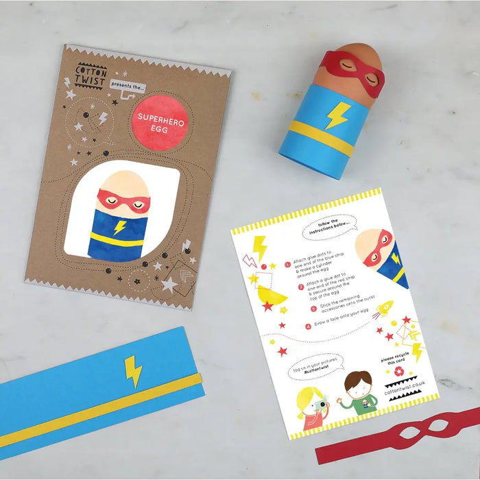 Perfect for three years & upwards, children can use the cut outs & glue dots to create their superhero egg character. With everything you need included, this is a great activity for a festive Easter breakfast or any day of the year. Cotton Twist craft activities are often gifted as party bag or stocking fillers. In a bid to banish plastic from our homes, Cotton Twist products are lovingly assembled by hand, & all components are as good as we can possibly make them. MATERIAL - cardboard cut outs, glue dots, A6 instruction card DIMENSIONS - a recyclable kraft envelope measuring 16.5cm by 11.5cm together with an A6 printed instruction card