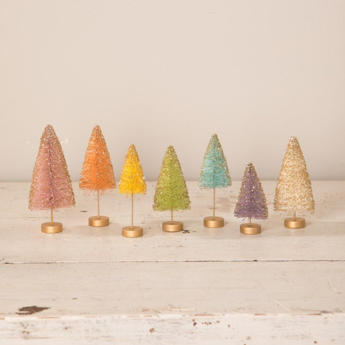 Catch the rainbow with this adorable 7 piece set of gold glittered, pastel, bottle brush trees.