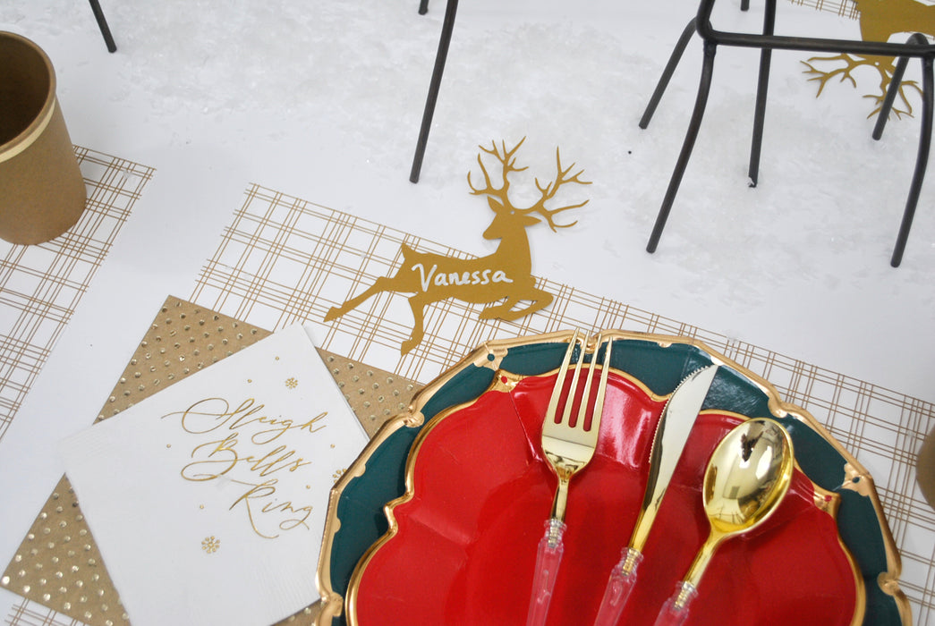 This Christmas party is all about rustic charm. The masculine plaid mixed with the feminine shapes of the plates make a design everyone will love. The centerpieces are metal and can be kept forever, and the deer cutouts can be used for place cards!