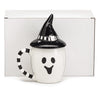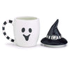 White mug with a ghost face and Black witch hat. Has a white band with a silver buckle for a lid and a black and white striped handle.Ceramic mug. Individually gift boxed.7"H x 3"Opening. Capacity: 12 ozWithout lid: 3 1/2"H