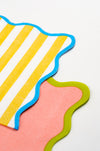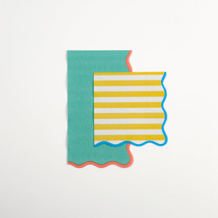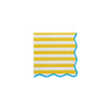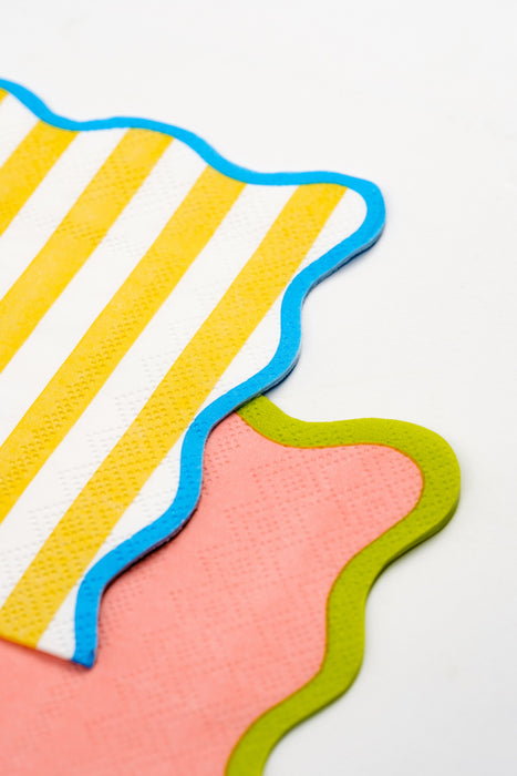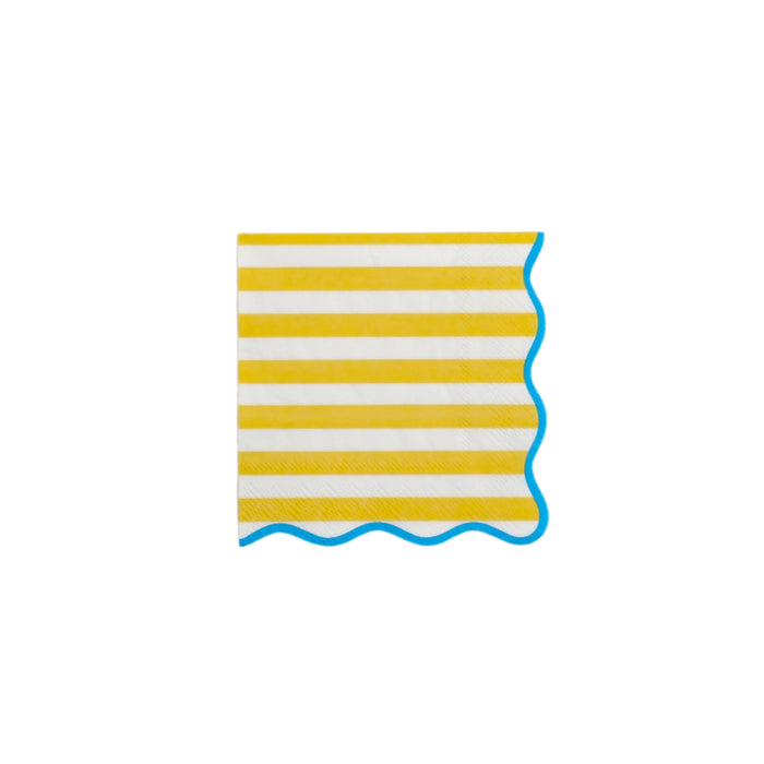 These summer cocktail napkins feature a chic striped design with alternating sunny yellow and white horizontal bands. A playful twist is added with wavy blue edges, evoking the feel of ocean waves and beachside fun. The combination of bold stripes and unique borders makes these napkins perfect for casual summer gatherings, poolside drinks, or seaside celebrations. Both stylish and practical, they bring a fresh, summery vibe to any cocktail party or outdoor event.