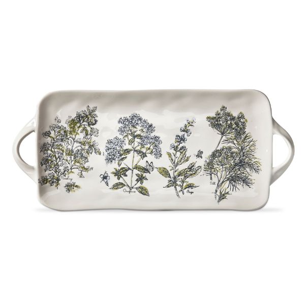 It's all in the details. spring and summer get-togethers call for bright colors and eye-catching designs. Serve up your appetizers and hors d'oeuvres alongside fun garden scenes with our herb platter. Made from earthenware, this platter features an organically shaped body with a wax resist and hand painted design. This piece is finished with a glossy glaze.