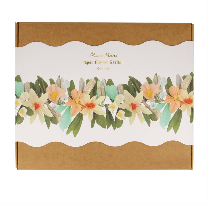 This floral garland will add instant style to a spring table setting or Easter party setup. It's beautifully crafted with crepe paper flowers and taupe gingham ribbon.