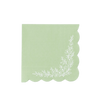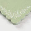 Elevate your spring tablescape with our softly scalloped cocktail napkins finished with an intricate corner bouquet, petite blossoms and leafy sprigs rendered in fine ivory linework. The artwork nods to vintage china yet feels fresh and airy, with delicate negative space that looks refined up close and romantic from across the table. Available in three coordinating hues blush pink, light blue, and sage, each color sets a gentle pastel backdrop that lets the botanical illustration shine.