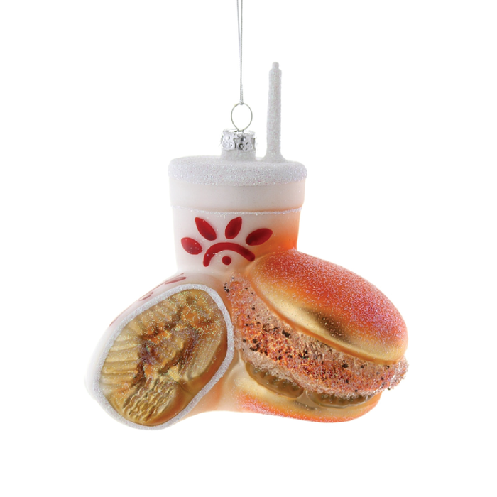 Add a touch of whimsy and fun to your tree with this season with this Fast Food chicken ornament. Perfect for creating a visually captivating and trend-setting holiday atmosphere.