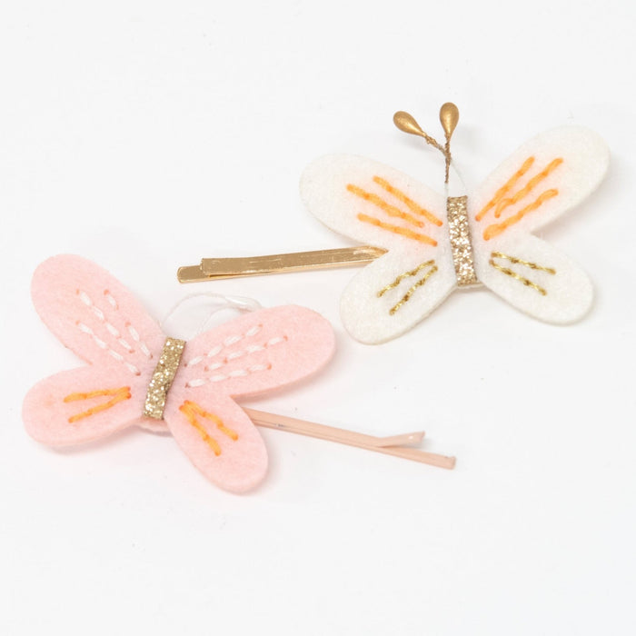 For a special occasion, add some extra embellishment to your hair with these beautiful butterfly hair slides. Crafted from felt and embroidered with shimmering gold details.