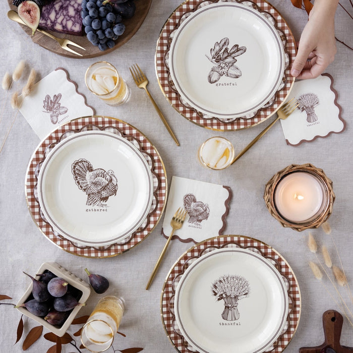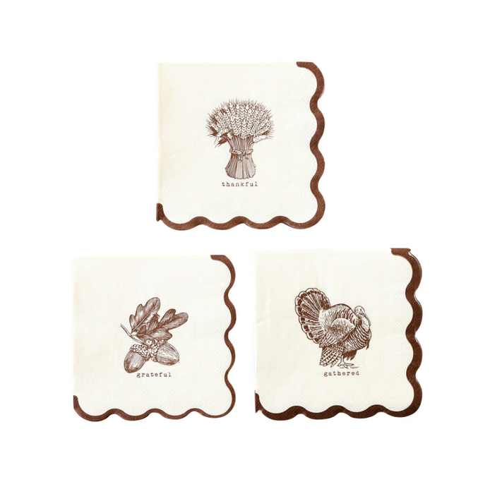 Create a beautiful and traditional tablescape this Thanksgiving with this cocktail napkin set. Featuring 3 classic Thanksgiving inspired icons, these scalloped edged napkins will make a cozy statement at your next Thanksgiving dinner.
