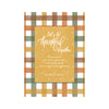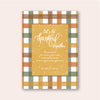 Cozy and grateful—our Thankful digital invitation features watercolor gingham in warm harvest hues with a dotted center panel and hand-lettered script.
