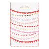 Featuring a mix of Valentine's wording, hearts, flags and scalloped shapes in gold foil and red, pink and peach tissue paper