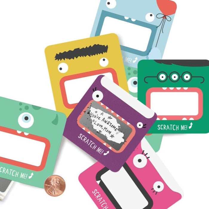 Make your little monster's Valentine's Day with this set of 18 scratch-off notes, and hide your OWN message in a scratch-off! Making them is easy: write your message in the white rectangle and cover it with the scratch-off sticker provided. Scratching will reveal your hidden message! These tiny notes are the perfect size for card exchanges, lunchboxes and more.