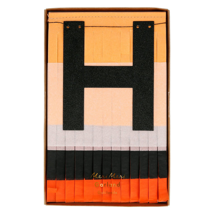 Spread Halloween joy with this statement garland. It is beautifully crafted from fringed tissue paper, with glittered letters spelling out "Happy Halloween".
