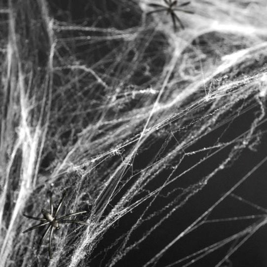 Includes 1 ( 70 g) bag of fake spider web with two black plastic spiders.