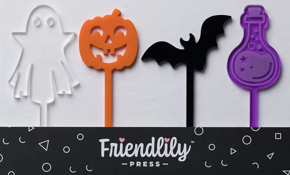 Satin ice ghost Orange jack-o-lantern Black bat Purple potion bottle Made of 1/8th inch acrylic and measure approximately 4.5" in height for garnish.