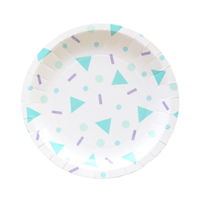 Bright, geometric confetti shapes dance across these plates in mint, teal, lavender, and blue, and we hope they'll get you dancing too!