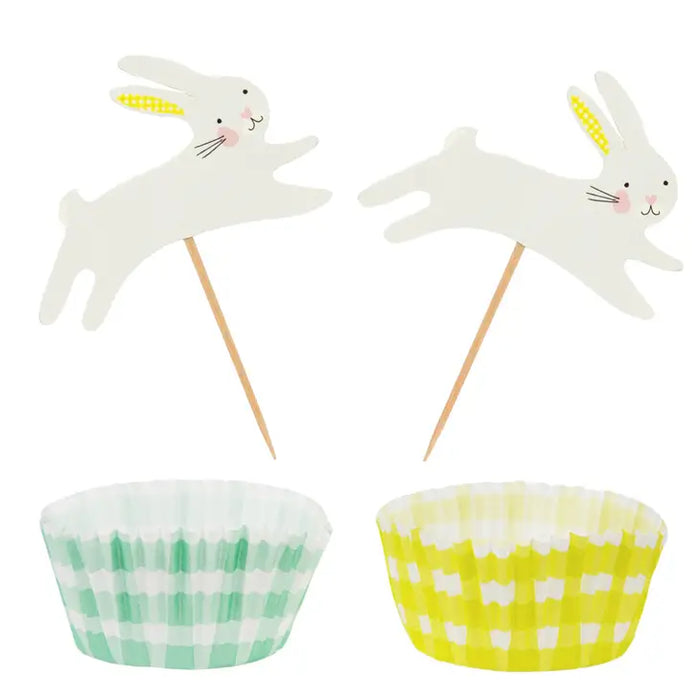 Easter Bunny Cupcake Kit by Talking Tables. Follow the cupcake recipe on the back of the box to bake a sweet treat for the Easter Bunny. Bake in the colorful cupcake cases then top with the white rabbit cake toppers - sure to make your guests smile on Easter Sunday. Includes: 12 x yellow gingham cupcake cases 12 x green gingham cupcake cases 24 x grey bunny toppers