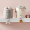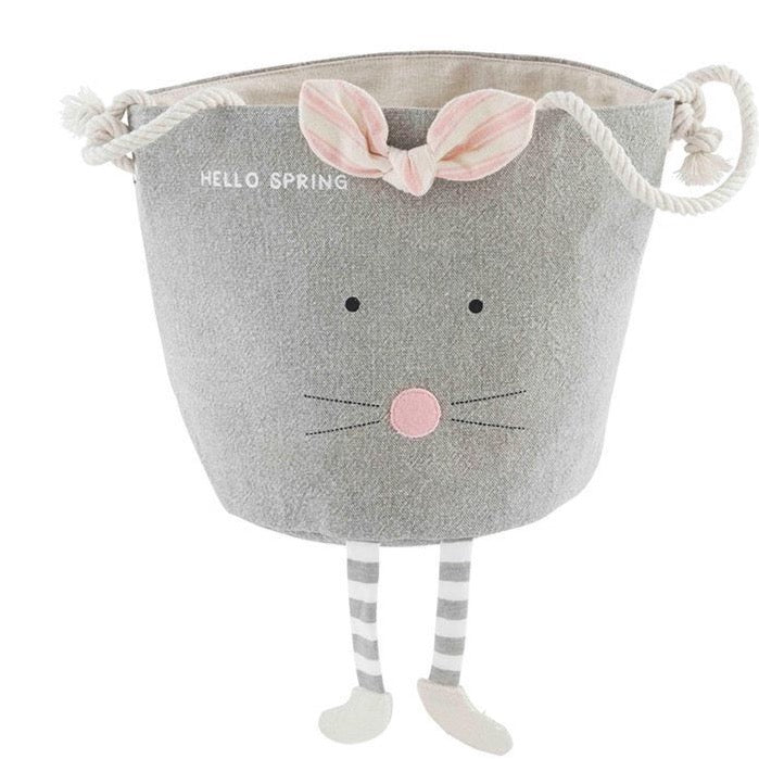 Canvas bunny bucket features rope handle, wire ears and dangle legs.