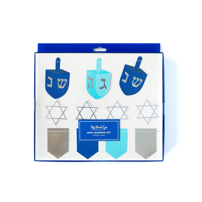 Create a an elegant backdrop for you Hanukkah gatherings. These mini banners are perfect to create a beautiful tablescape. The dreidel banner will inspire hours dreidel of fun! The classic silver foil star banner shines, and the pennant banner help set a festive mood for your Hanukkah parties.