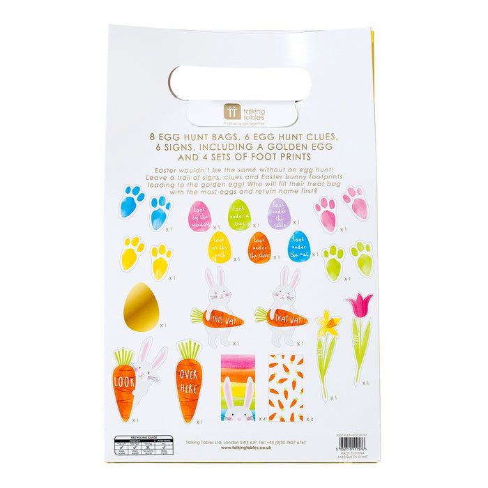 Each kit contains 8 treat bags, 6 egg hunt clues, 6 signs and 4 sets of bunny footprints.