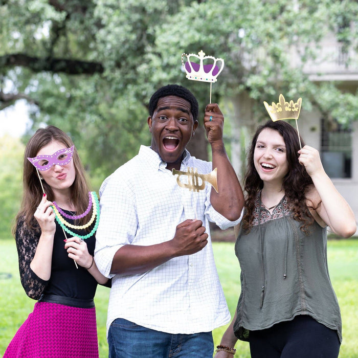 You can't have a photo booth with out props, these Mardi Gras inspired props are the perfect addition. Make your selfie station the place to be at your Fat Tuesday party with these fun props. Make these photo props pop by creating a festive photo backdrop with our mask and coin banners.