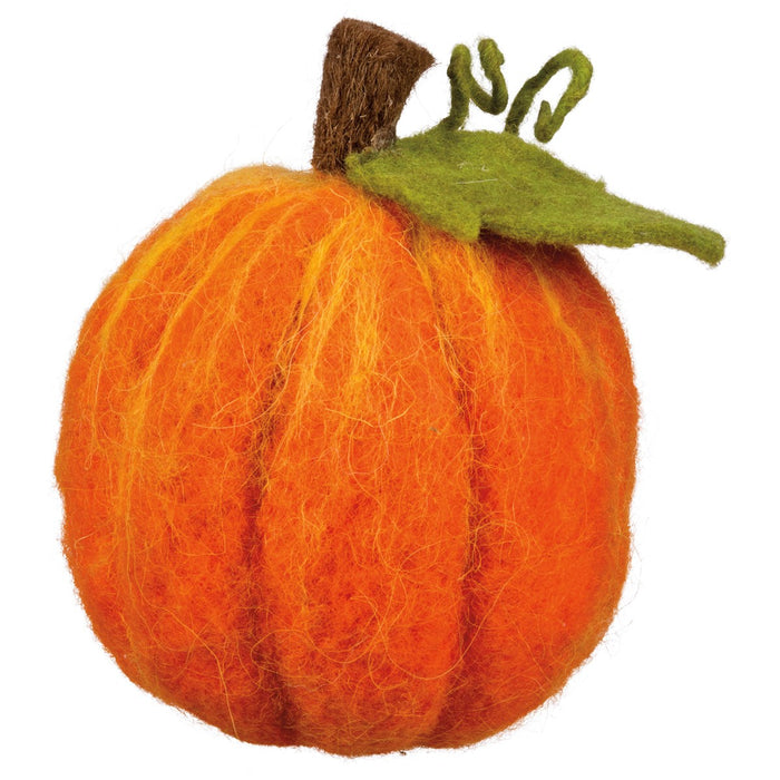 This Orange felt pumpkin features stem, leaf, and vine details in an autumn palette. A great addition to your Fall or Halloween home decor or party tablescapes.