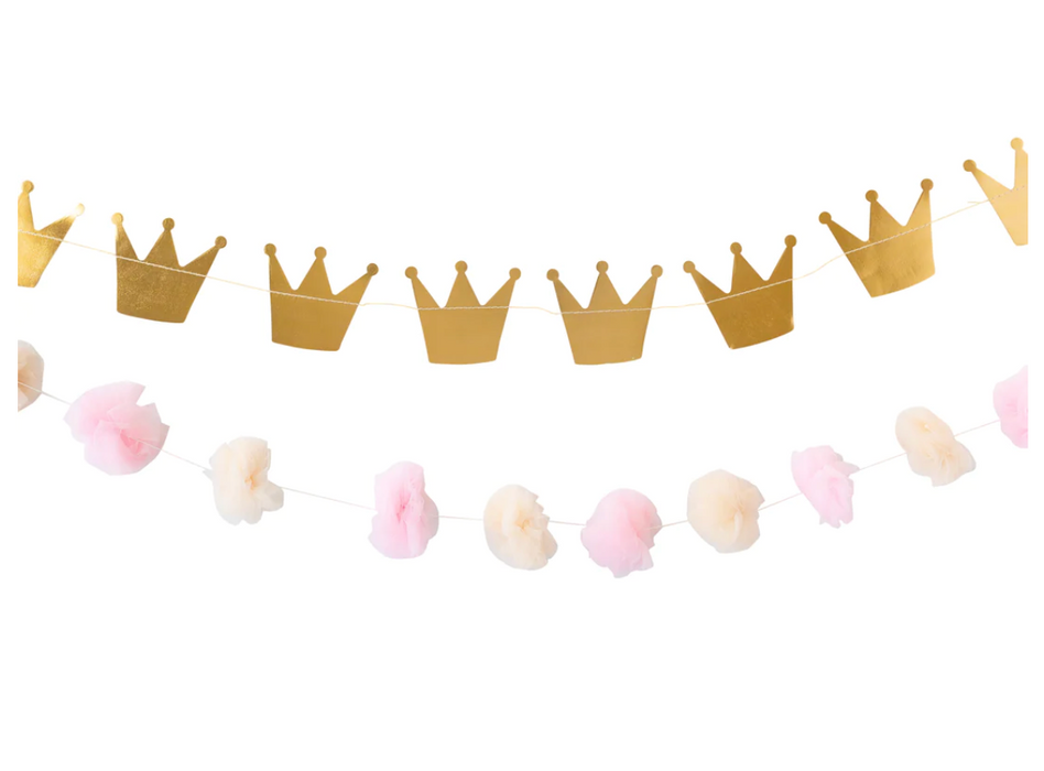 Crown your princess party with this crowns and pom pom tulle banner set! Included is a gold foil crown banner that turns any space into a room fit for a princess. And the cream and pink tulle pom pom banner adds a touch of fanciful whimsy fit for a fairy tale. This princess inspired banner set will turn any birthday party, baby shower or bedroom into royal space in a snap.