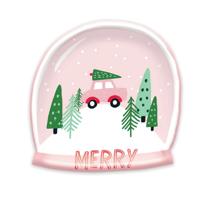 Set your holiday table with these winter wonderland snow globe shaped plates. Featuring a whimsical winter scene these die cut party plates add holiday magic to any Christmas party that needs a touch of merriment!