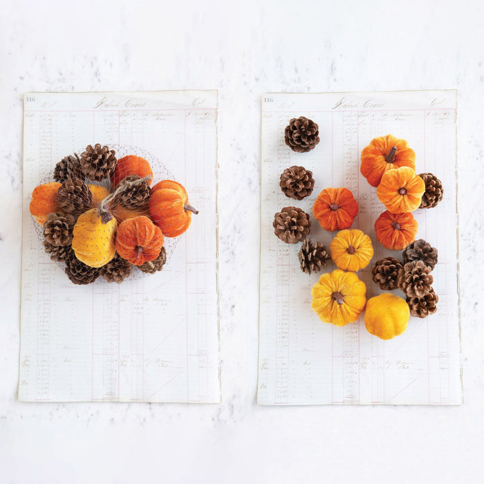 These adorable pumpkins are a must-have for the fall season. Made out of velvet, these pumpkins have an orange and natural finish perfect for autumn. These pumpkins look great on coffee tables, shelves, and in bundles of other pumpkins for a festive and stylish table display.