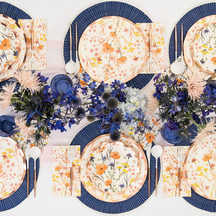 These ruffled edge plates have a rose gold foile trim and feature gorgeous peach colored wildflowers! Add a a touch of elegance to your spring gatherings! Impress your guests with these perfect pieces.Your guests will not believe that these are paper plates!