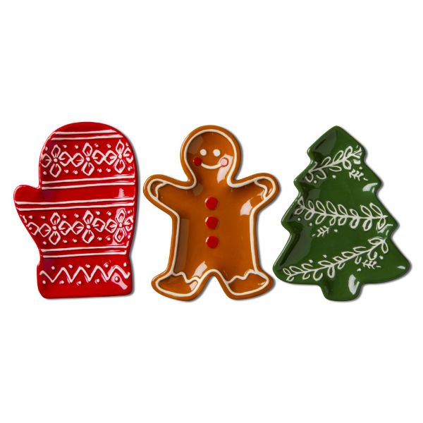 make the season merry and bright! made in the shapes of a holiday tree, gingerbread, and mittens, this adorable assortment features a beautiful sculpted design and hand-painted details. perfect for serving small snacks or to use as a coffee table accent or trinket dish.surely a festive addition to any holiday display!